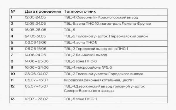 5–16 июля — зона Кировской районной котельной, цех № 1: улицы Комсомольская, Чигорина, Герцена, Оловозаводская (С.-Чемской жилмассив), Урманова, Кожевникова, Оловозаводская, Аникина, Обогатительная, 20 Партсъезда (м-н Бугринская роща), ЖК «Черемушки», Бетонная, Бурденко, Ударная, Тульская, Беловежская, Мира, Петухова, Зорге, Громова, Д. Шмонина, Виктора Уса, Паласса, С.-Гвардейцев (Затулинский жилмассив), Акатуйский жилмассив; ЖК «Матрешкин двор», Северный проезд.