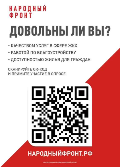 Министерство строительства и жилищно-коммунального хозяйства Российской Федерации совместно со Счетной палатой Российской Федерации и общероссийским общественным движением «НАРОДНЫЙ ФРОНТ «ЗА РОССИЮ» проводит онлайн-опрос населения с использованием QR-кода по вопросу качества городской среды, предоставления жилищно-коммунальных услуг (ресурсов) и доступности жилья.